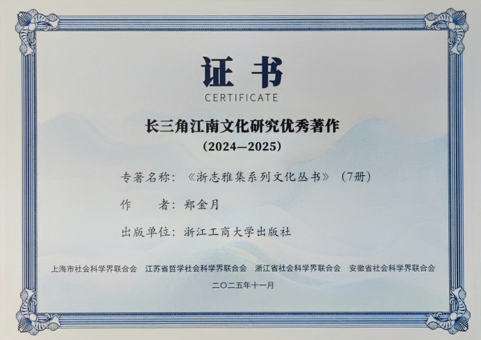 “浙志雅集”系列文化丛书创作立足古今方志,以挖掘方志资源、普及方志文化为目的,打造《风俗集》《非遗集》《商贸集》《食饮集》《奇人集》《名胜集》《驿舍集》七本佳作。以一套通俗读物为鲜活载体,将地方文化转译为群众喜闻乐见的公共知识,为其搭建展示与传播的广阔平台,为公众提供认知家园、理解传统的生动样本,助力文化在代际间绵延传承。据悉,本次长三角江南文化论坛共评选出4部优秀著作,“浙志雅集”系列文化丛书为浙江省唯一入选的作品。